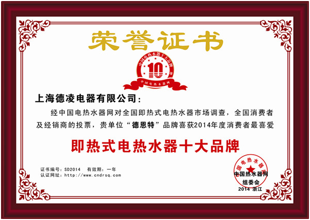 上海德凌電器有限公司經(jīng)中國(guó)電熱水器網(wǎng)對(duì)全國(guó)即熱式電熱水器市場(chǎng)調(diào)查,全國(guó)消費(fèi)者及經(jīng)銷商投票,“德恩特”品牌喜獲“2014年度消費(fèi)者最喜愛(ài)即熱式電熱水器十大品牌”并連續(xù)4年獲得排名第一。