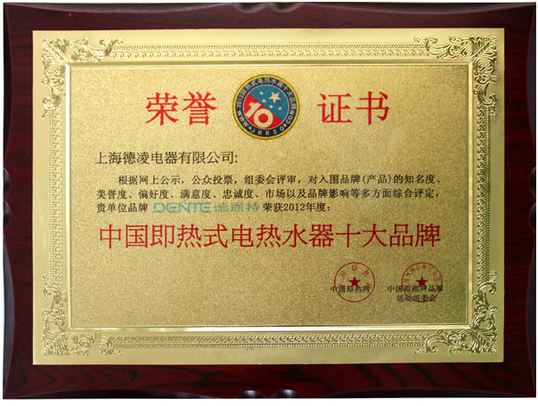 根據(jù)網(wǎng)上公示、公眾投票,組委會(huì)評(píng)審,為入圍品牌(產(chǎn)品)的知名度、美譽(yù)度、偏好度、滿意度、忠誠(chéng)度、市場(chǎng)以及品牌影響等多方面綜合評(píng)定,上海德凌電器有限公司品牌德恩特榮獲2012年度中國(guó)即熱式電熱水器十大品牌。 【中國(guó)即熱網(wǎng)www.jrrsq.com】